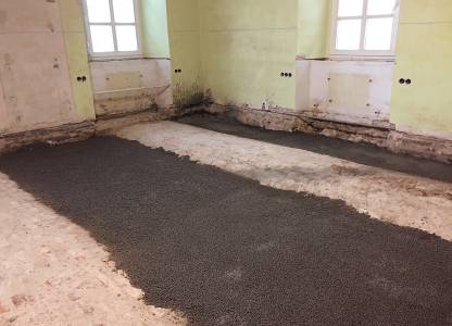 V průběhu sanace měla být opětně zviditelněna historická valená klenba, která tvoří strop mezi přízemím a horním patrem. Zespoda bylo demontováno bednění stropu, které se zde nacházelo, a shora byla odstraněna stará konstrukce podlahy včetně pod ní se nacházejícího plnicího materiálu. Po dodatečných statických opatřeních a po odstranění poškozených míst bylo nutno stanovit vhodnou konstrukci podlahy. „Zde byla vyžadována obzvláště lehká stropová výplň, která přesto zaručí nutnou stabilitu a nosnost. Kromě toho měla výplň splňovat požadavek na její rychlé a snadné nanesení a měla vykazovat rychlou použitelnost“, dodává Urban Meiller. „Tato zadání bylo možné perfektně realizovat prostřednictvím lehkého keramického betonu Liaporbeton.“